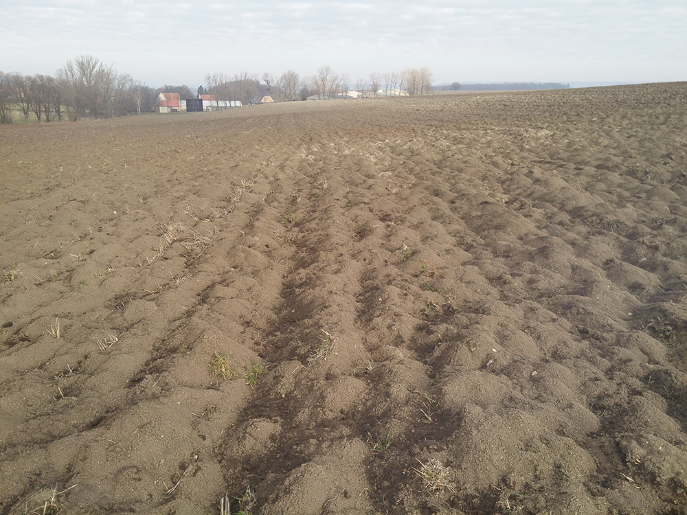 Nejrychleji vysychají pozemky ve svazích orientovaných na jih, které byly naorány a mají překypřenou půdu s velkými nerovnostmi, tím i velkou povrchovou plochu (foceno 16.1.2020).